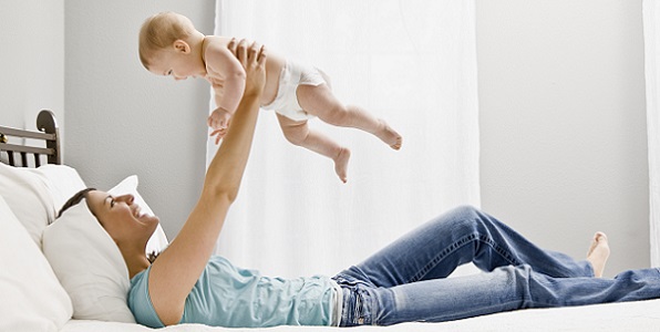 – En este periodo tu bebé ya es capaz de levantar la cabeza con más facilidad y durante más tiempo cuando está tumbado. Ponte en el suelo junto a él para que tenga que levantar la mirada para poder verte.
