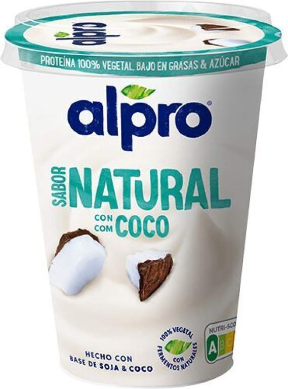 base de soja (93,1%) (agua, habas de soja descascarilladas (10,4%)), base de coco (6,2%) (agua, crema de coco (2,9%)), azúcar, calcio (citrato tricálcico), estabilizantes (pectinas), correctores de acidez (citratos de sodio, ácido cítrico), aromas naturales, sal marina, antioxidantes (extracto rico en tocoferoles, ésteres ácidos grasos de ácido ascórbico), vitaminas (B12, D2), fermentos (S. thermophilus, L. bulgaricus). Puede contener trazas de frutos de cáscara (no cacahuetes). Sin lácteos y sin gluten.