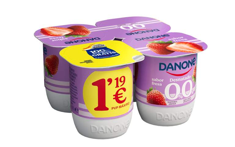 Leche desnatada pasteurizada, leche en polvo desnatada, fermentos lácticos, aroma, gelatina, colorante (carmines), edulcorantes (acesulfamo K y sucralosa) y vitamina D. Origen de la leche: España