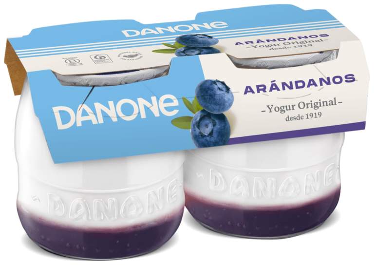 Yogur natural azucarado (78%) [leche pasteurizada, azúcar (7%), leche en polvo desnatada, nata pasteurizada y fermentos lácticos] y preparado de arándano (22%) [arándano (40%) y zumo de arándano (10%), azúcar, jarabe de glucosa, almidón modificado de maíz, espesantes (pectinas y goma guar), correctores de acidez (citratos de sodio y calcio y ácido cítrico) y aroma]. Origen de la leche: España.