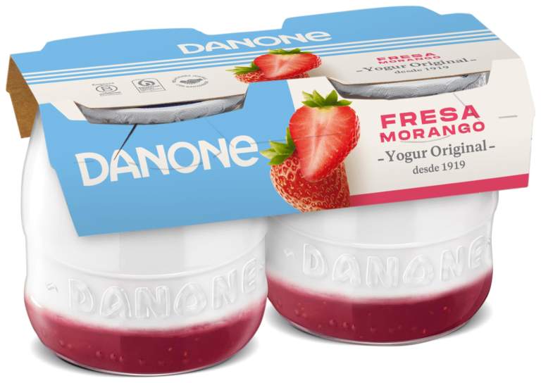 Yogur natural azucarado (78%) [leche pasteurizada, azúcar (7%), leche en polvo desnatada, nata pasteurizada y fermentos lácticos] y preparado de fresa (22%) [fresas (50%), jarabe de glucosa, azúcar, almidón modificado de maíz, espesante (pectinas), aroma, correctores de acidez (citratos de sodio y calcio) y colorante (carmines)]. Origen de la leche: España.